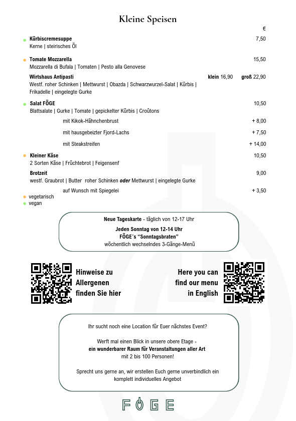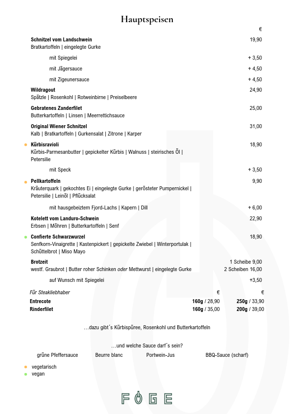 Im Wirtshaus Föge in Herford erwartet Dich Genuss aus Tradition. Unsere Abendkarte reicht von bodenständiger Hausmannskost bis hin zu feinen Klassikern. Ob westfälisches Krüstchen und Kotelett oder ein kreatives Gemüsegericht und Käseteller – unsere Auswahl ist so vielfältig wie unsere Gäste und sorgt dafür, dass jeder auf seine Kosten kommt.
