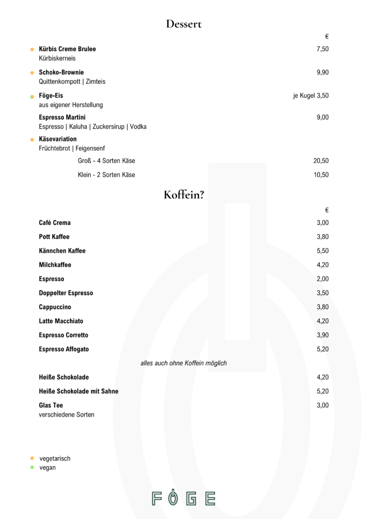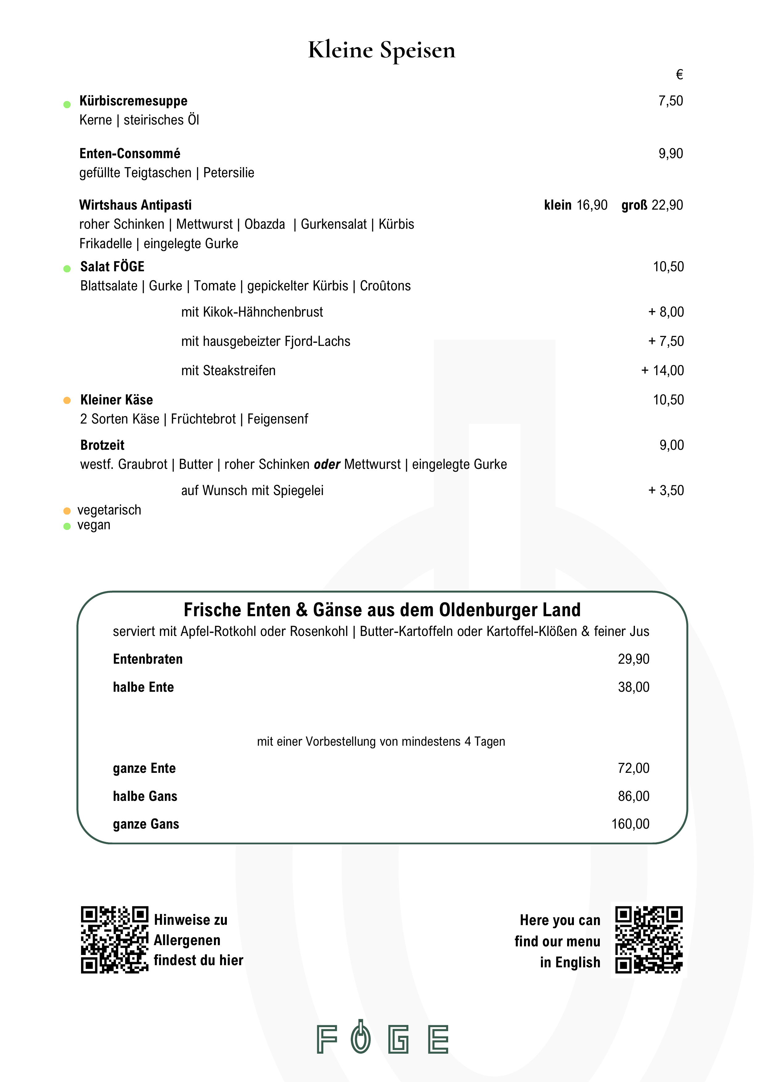 Im Wirtshaus Föge in Herford erwartet Dich Genuss aus Tradition. Unsere Abendkarte reicht von bodenständiger Hausmannskost bis hin zu feinen Klassikern. Ob westfälisches Krüstchen und Kotelett oder ein kreatives Gemüsegericht und Käseteller – unsere Auswahl ist so vielfältig wie unsere Gäste und sorgt dafür, dass jeder auf seine Kosten kommt.