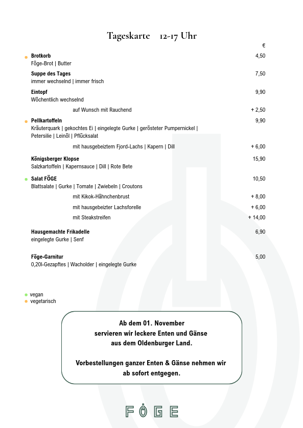 Zwischen 12 und 14 Uhr servieren wir Dir im Wirtshaus Föge Genuss aus Tradition für die Mittagspause. Unser Mittagstisch bietet abwechslungsreiche Gerichte – von leichter Suppe oder frischem Salat bis hin zu Klassikern wie Königsberger Klopse oder Ofenkartoffeln in verschiedenen Variationen. Ideal für den schnellen Business-Lunch, eine gemütliche Mittagspause mit Kollegen oder auch für alle, die beim Stadtbummel in Herford eine Stärkung suchen.